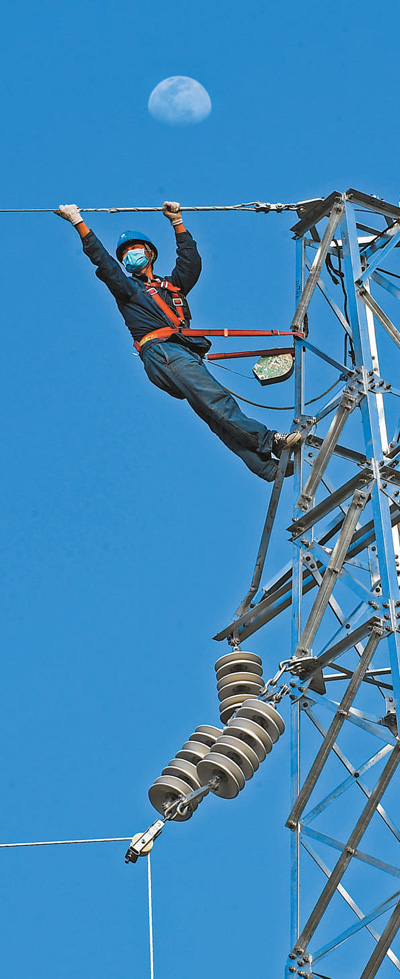 4月4日,在安徽省亳州(zhou)市譙城區,國網(wang)亳州(zhou)供電公司電力工人正(zheng)在架設輸電線路(lu)。張延林攝(影像(xiang)中國)