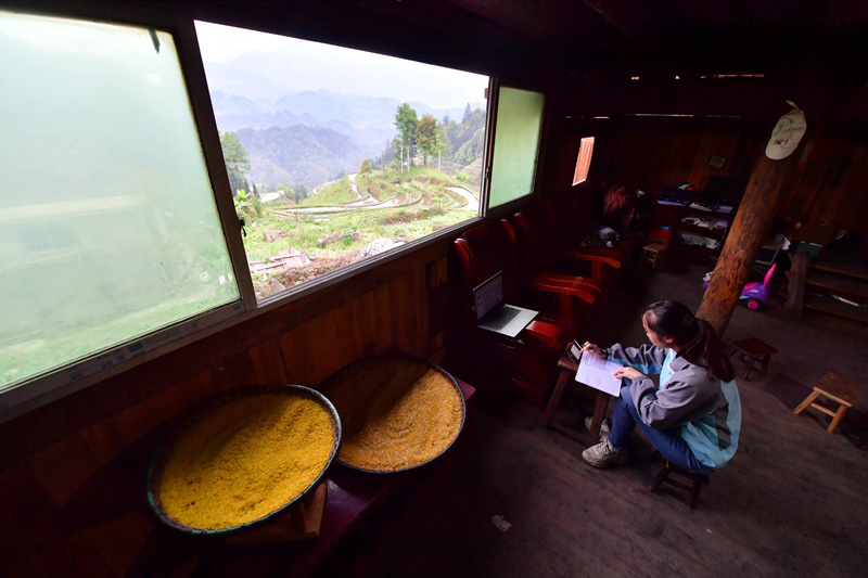 在廣西融水苗族自治縣桿洞鄉黨鳩村,就讀于廣西科技師范學院的梁孟香在家里上網課(4月9日攝)。