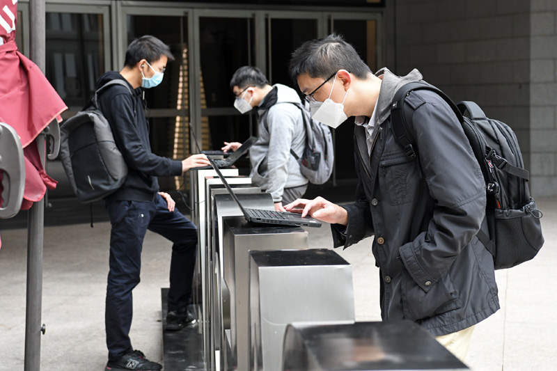 在深圳平安金融中心,企業員工在樓下使用筆記本電腦連接公司內網下載安裝遠程辦公軟件,以便實現居家“云辦公”(2月10日攝)。