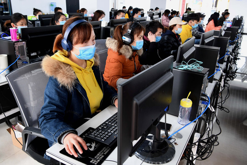 在河南省信陽市光山縣科思網絡科技有限公司內,被稱為“人工智能訓練師”的員工戴著口罩和耳機作業(3月28日攝)。