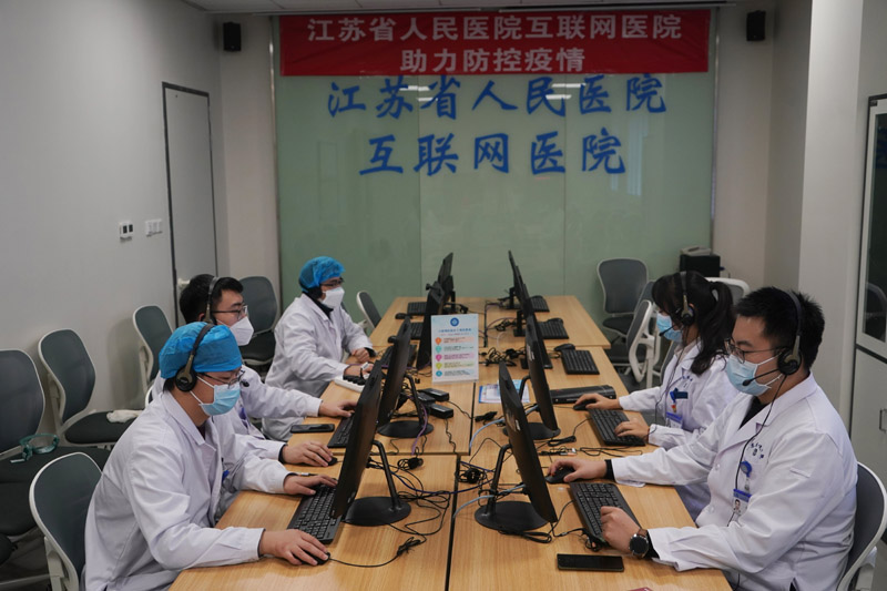 在江蘇省人民醫院互聯網醫院辦公室,醫生和信息處的工作人員在工作(2月7日攝)。