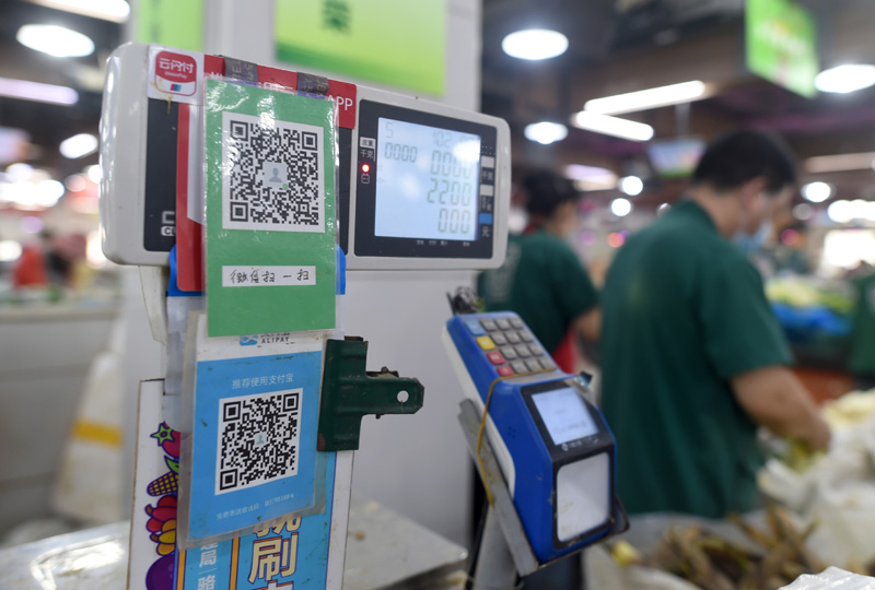 這是5月17日拍攝的浙江省杭州市的5G農貿市場——駱家莊農貿市場一個攤位上的多種支付渠道提示。該農貿市場實現了健康碼、聚合支付碼、區塊鏈安全溯源碼“三碼合一”。