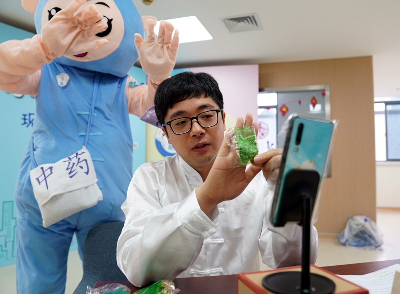 在上海市黃浦區打浦橋街道社區衛生服務中心,家庭醫生王杰在直播中介紹夏季中藥茶飲知識(5月26日攝)。