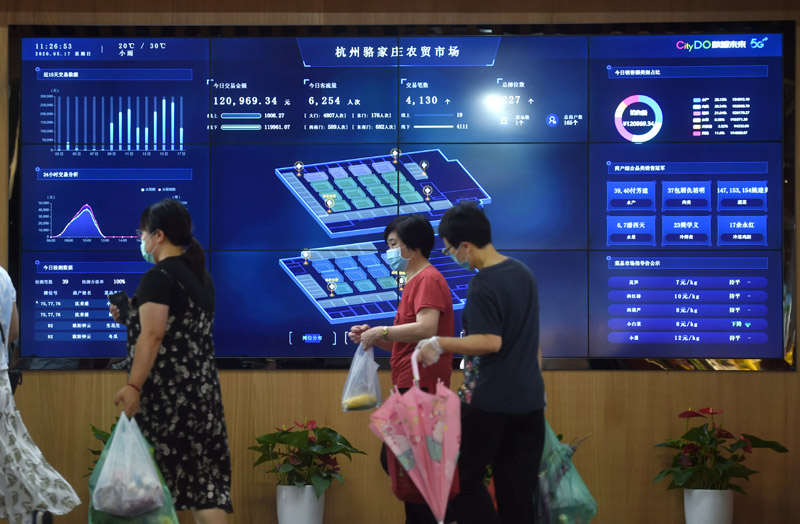 浙江省杭州市的5G農貿市場——駱家莊農貿市場的大屏幕上實時顯示交易、客流等相關情況(5月17日攝)。