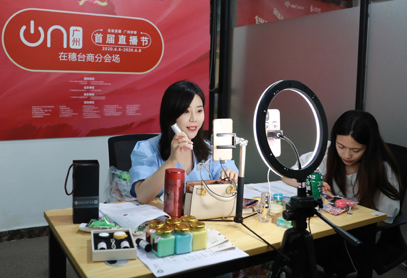 6月6日,廣州啟動“首屆直播節”活動,這是主播在廣州市白云區臺商分會場直播帶貨。