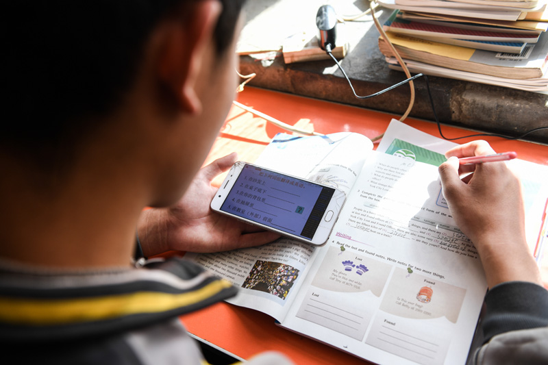 內蒙古準格爾旗龍口鎮紅樹梁村的初一學生劉進才在家中上網課(3月10日攝)。