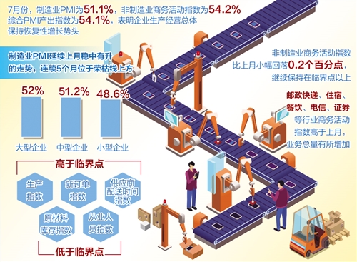 7月31日,國(guo)家統計局服務(wu)業(ye)調查中(zhong)心和中(zhong)國(guo)物流與采(cai)(cai)購聯合會發布了中(zhong)國(guo)采(cai)(cai)購經理指數。7月份,制(zhi)造(zao)業(ye)PMI為(wei)51.1%,延(yan)續(xu)穩中(zhong)有(you)升(sheng)走勢(shi);非(fei)制(zhi)造(zao)業(ye)商(shang)務(wu)活(huo)動指數為(wei)54.2%,繼續(xu)保(bao)持在臨界點以上。綜合PMI產出指數為(wei)54.1%,表明企業(ye)生產經營(ying)總體保(bao)持恢復(fu)性增長勢(shi)頭。