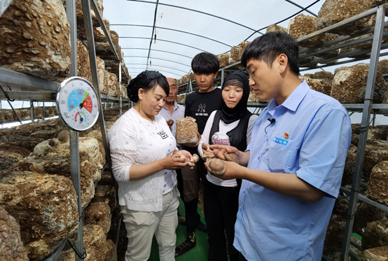 圖說:中建二局甘肅省康樂縣何家溝村駐村書記牛軍帥在香菇大棚內結對培訓。