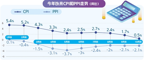 11月(yue)10日,國家(jia)統計局發布了(le)2020年10月(yue)份全國居民消費價(jia)格指數(CPI)和(he)工(gong)業生產者(zhe)出廠價(jia)格指數(PPI)數據。10月(yue)份,CPI同(tong)比(bi)(bi)上漲(zhang)0.5%,自2017年3月(yue)份以來時隔42個月(yue)首次(ci)回(hui)到“1”以內(nei);PPI同(tong)比(bi)(bi)下降2.1%,環比(bi)(bi)持平(ping)。