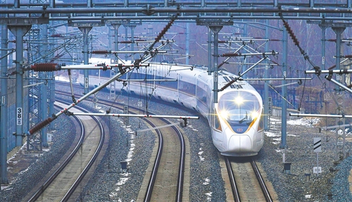 在遼寧沈陽珠江橋附近,一輛從沈陽北站開往北京朝陽站的復興號列車行駛在京哈高鐵線上(1月22日攝)。