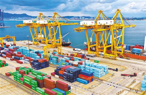 幾艘貨輪在大連港大連集裝箱碼頭有限公司港口內裝卸集裝箱(2020年9月24日攝,無人機照片)。
