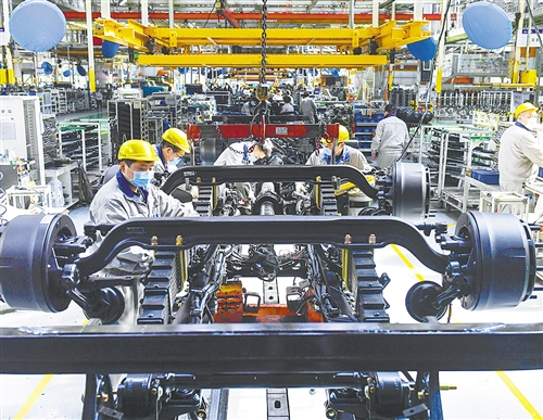一汽解放汽車有限公司職工在長春生產基地總裝車間內進行裝配作業(2020年4月9日攝)。