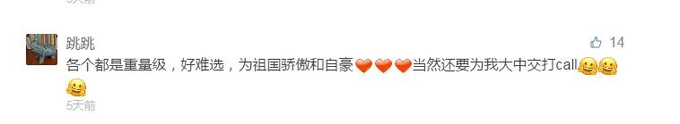 網友@跳跳“各個都(dou)是重量級,好難選,為祖國驕(jiao)傲和自豪,當(dang)然(ran)還要為我(wo)大中交打(da)call”。