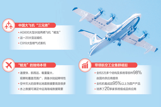 近日,AG600大(da)型(xing)水陸兩棲飛機“鯤龍”首(shou)飛成功(gong),黨中央(yang)、國務院發賀電表示熱烈的祝賀和(he)親切(qie)的慰問(wen)。AG600與運—20大(da)型(xing)運輸機、C919大(da)型(xing)噴(pen)氣式客(ke)機一起,被稱(cheng)為(wei)中國大(da)飛機“三(san)兄(xiong)弟”。