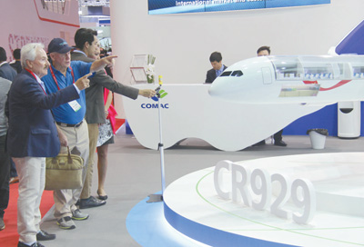 中國商(shang)飛展示的CR929客機模型吸引了眾多交易商(shang)的目光(張志文 攝)