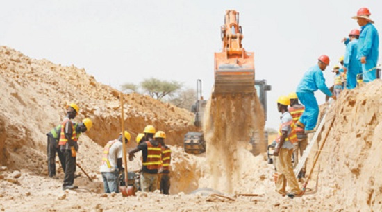 中塞兩國工人正在鋪設飲水工程管道。(記者 呂強攝)