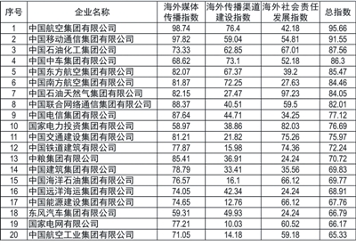 表1:96家中央企業海外品牌形象傳播指數排行榜(總榜TOP20)
