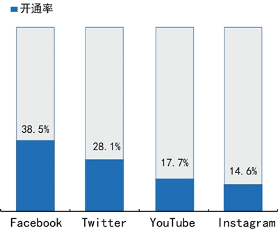 其中(zhong),Facebook開通率為38.5%,Twitter開通率為28.1%。中(zhong)央企業也(ye)在(zai)試水布(bu)局視(shi)頻、圖(tu)片類海外新媒體(ti)平臺,觸達不同圈(quan)層的受眾群體(ti)。其中(zhong),YouTube開通率為17.7%,Instagram開通率為14.6%。