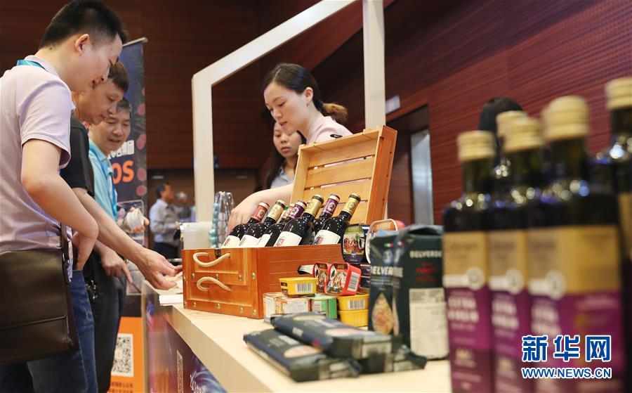 在上海舉行的2018中國國際進口博覽會食品展商客商供需對接會上,參觀者向展商工作人員咨詢商品信息(6月14日攝)。 (新華社記者 方喆 攝)