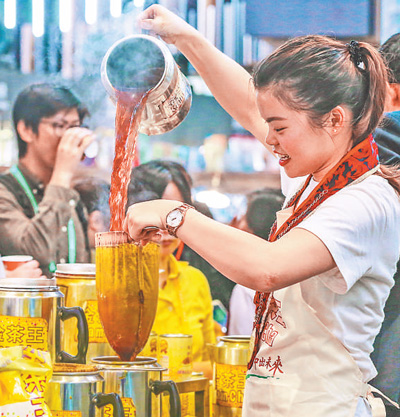 食品及農產品展區,參展人員制作“金茶王”港式奶茶。(新華社記者 殷 剛攝)