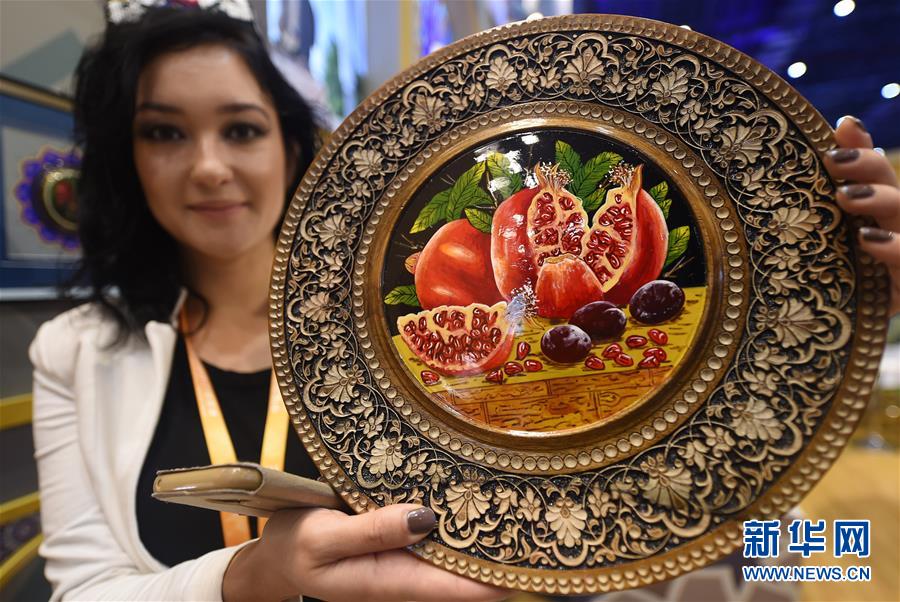 11月8日,烏茲別克斯坦參展人員展示手工制作的核桃木工藝品。 (新華社記者 韓瑜慶 攝)
