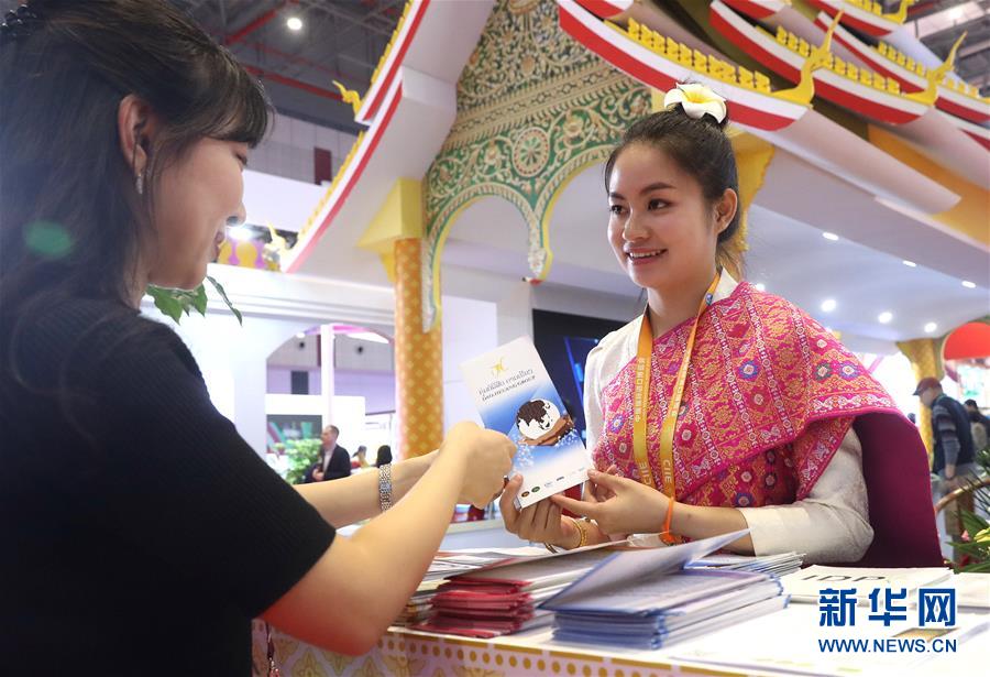 11月7日,在首屆中國國際進口博覽會上,老撾展區工作人員(右)在向參觀者介紹情況。(新華社記者 陳飛 攝)