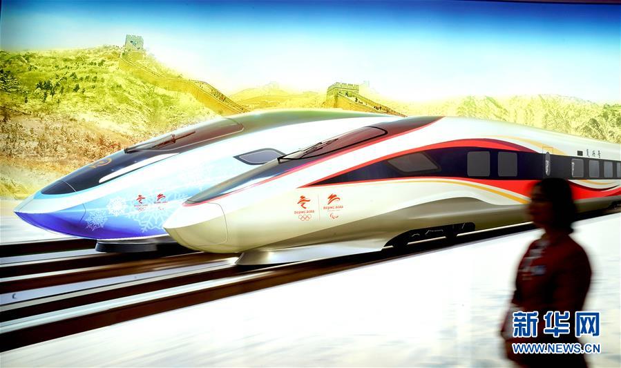 11月8日,一位志愿者從進博會中國館一幅高鐵概念圖前走過。 (新華社記者 陳建力 攝)