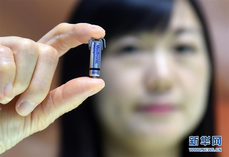 11月8日,在進博會醫療器械及醫藥保健展區美敦力公司展臺,工作人員在展示全球最小的心臟起搏器。(新華社記者 韓瑜慶 攝)