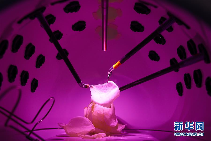 11月8日,在進博會醫療器械及醫藥保健展區,達芬奇Xi手術系統在演示切割花瓣。(新華社記者 劉大偉 攝)