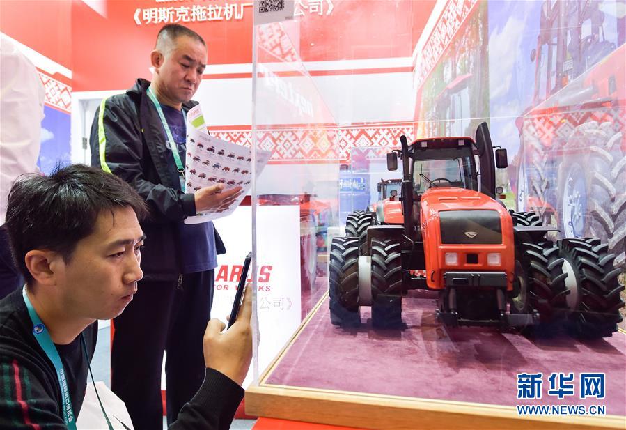 11月7日,參觀者在拍攝、觀看白俄羅斯明斯克拖拉機廠的拖拉機模型。 (新華社記者 李賀 攝)