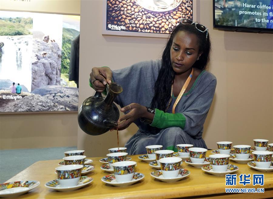 11月6日,在首屆中國國際進口博覽會上,埃塞俄比亞參展人員為參觀者倒咖啡。(新華社記者 沈伯韓 攝)