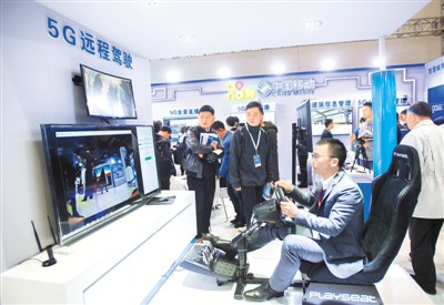 11月14日,在第十五屆“中國光谷”國際光電子博覽會上,觀眾在中國移動展區體驗5G遠程駕駛。(攝影 熊琦)