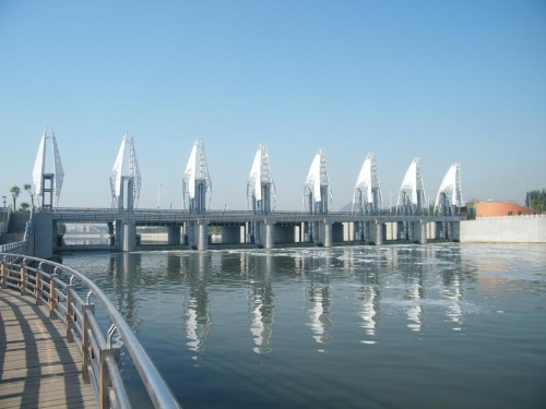 一渠清水,兩(liang)縱石(shi)堤,楊柳依(yi)依(yi),洪(hong)園(yuan)(yuan)節制閘(zha)(zha)7對閘(zha)(zha)門如7對潔(jie)白羽翼,優雅矗立在青天碧水之中,著實美不勝收。洪(hong)園(yuan)(yuan)節制閘(zha)(zha)還有個響(xiang)當當的(de)名(ming)頭——小清河(he)上第一閘(zha)(zha)。作為濟(ji)南主城區唯一泄洪(hong)河(he)道(dao)(dao)上最重要的(de)一道(dao)(dao)控制性閘(zha)(zha),它對市區防洪(hong)可(ke)以說起(qi)著決定性作用,更關乎著小清河(he)上游(you)千萬濟(ji)南市民的(de)生命安全。“汛期(qi)泄洪(hong)保證濟(ji)南市汛期(qi)安全,非汛期(qi)在上游(you)形成景觀(guan)水面。”這(zhe)是洪(hong)園(yuan)(yuan)節制閘(zha)(zha)在規劃(hua)之初就(jiu)被賦(fu)予的(de)功能。