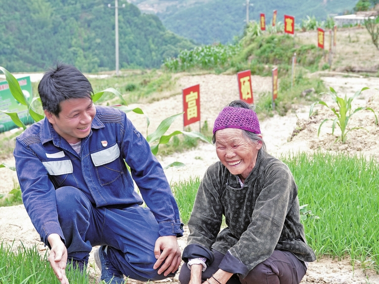 坡索村75歲老人張秀潔向廣西電網公司駐村第一書記鐘金宏聊起自家富硒米收成時笑逐顏開