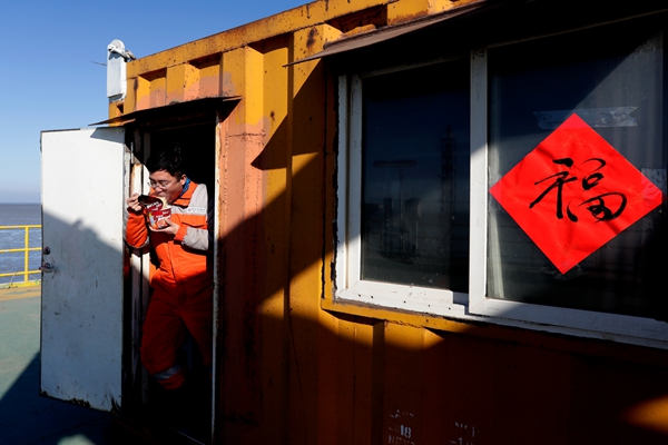 2月3日,臘月二(er)十九(jiu),微(wei)風,少(shao)冰,這(zhe)是(shi)年(nian)前最后(hou)一(yi)次(ci)看望(wang)“老友(you)”了(le)。送他來的(de)拖輪遠去,大海中央(yang)的(de)WHPB平臺(tai)又恢復了(le)寧靜(jing)。規定動作(zuo)之后(hou),鄭旭(xu)一(yi)在工作(zuo)間(jian)的(de)門上(shang)貼(tie)了(le)前一(yi)天寫(xie)好(hao)的(de)“福”字。作(zuo)為一(yi)個(ge)地道的(de)山東(dong)人,他固(gu)執(zhi)地覺得,即使(shi)無(wu)人值守,也不能少(shao)了(le)年(nian)味兒。