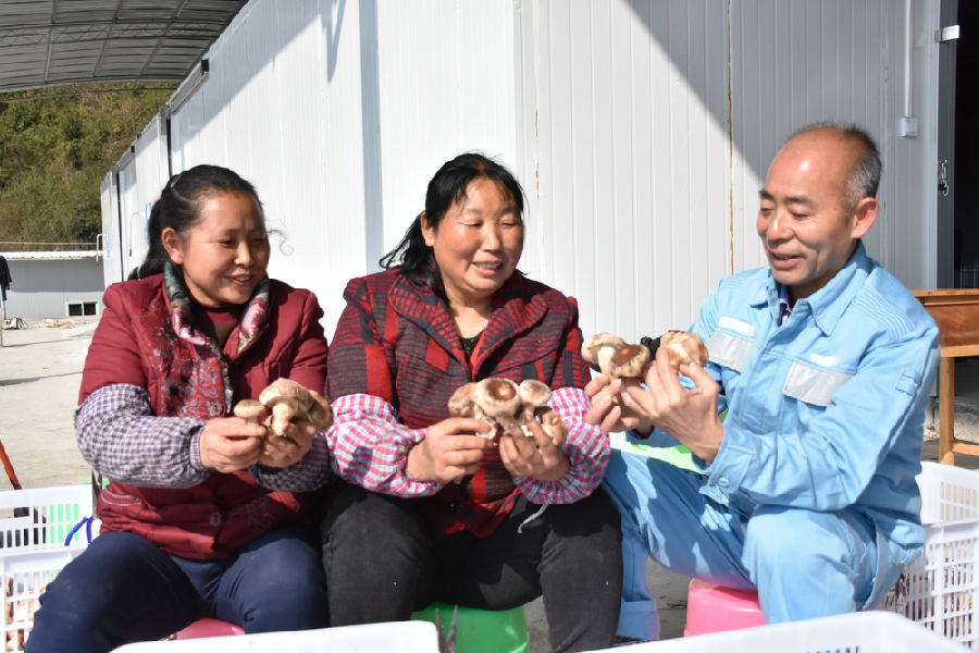 蘇遠清與貧困戶一起挑選香菇入市售賣。