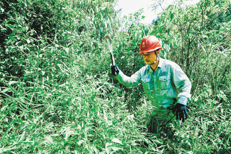 2019年8月9日,吳軍用砍刀在雜草叢生的山上砍出一條巡線的路。