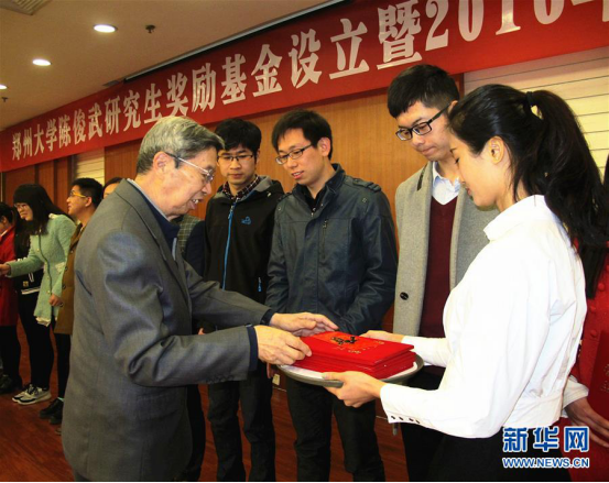 陳俊武院士(左)在鄭州大學為研究生頒發優秀論文獎(2016年3月26日攝)。 新華社發