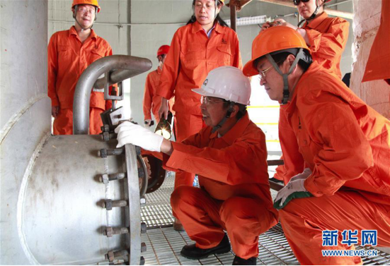 陳俊武院士(前左)在內蒙古包頭甲醇制烯烴(DMTO)現場檢查作業(2010年6月13日攝)。 新華社發