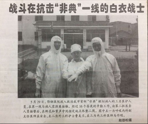 當時,曹美(mei)蘭的(de)(de)愛人周擁軍是鄂鋼醫(yi)(yi)院骨科的(de)(de)一名醫(yi)(yi)生,由于不在呼吸科,周擁軍沒有直(zhi)接參與(yu)非(fei)典(dian)疑似病例的(de)(de)治療,而是做了一些外圍工(gong)作(zuo)。