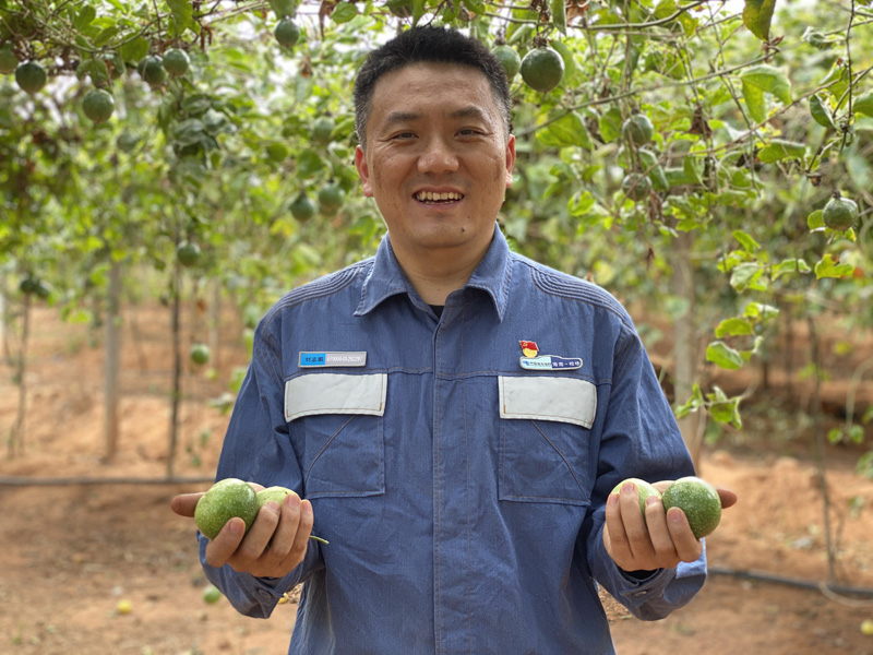 2020年1月10日,劉志鵬幫助脫貧戶在百香果園里采摘黃金百香果,露出開心的笑容。林丹丹 攝