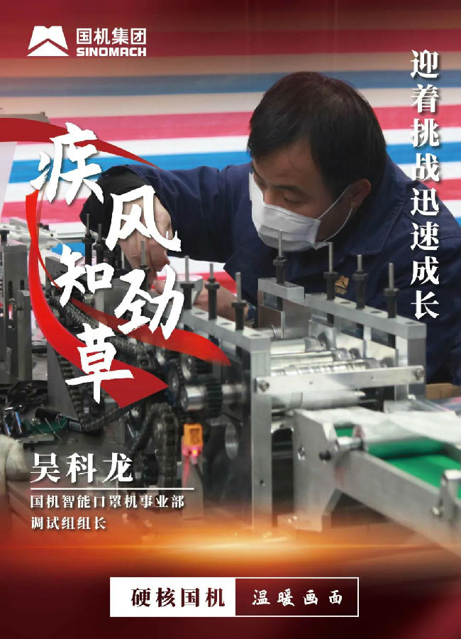 吳(wu)科龍(long)(long),國機(ji)(ji)(ji)(ji)集團下屬企業國機(ji)(ji)(ji)(ji)智(zhi)(zhi)能(neng)科技有限公司(si)(以下簡稱“國機(ji)(ji)(ji)(ji)智(zhi)(zhi)能(neng)”)一名普通技術人員(yuan)。年初,為(wei)應對疫情,國機(ji)(ji)(ji)(ji)智(zhi)(zhi)能(neng)展開口罩機(ji)(ji)(ji)(ji)的(de)研制,32歲的(de)吳(wu)科龍(long)(long)積極參加。因為(wei)項目(mu)成員(yuan)沒(mei)有口罩機(ji)(ji)(ji)(ji)研制經(jing)驗,機(ji)(ji)(ji)(ji)器拆了(le)又裝、裝了(le)又拆,反復調整,難度相(xiang)當大。多次調試達不(bu)到預(yu)期,大家心急(ji)如焚。吳(wu)科龍(long)(long)主動請纓,一頭扎進車間,忘我地干(gan)了(le)起來。他吃住在(zai)廠(chang)、經(jing)常兩班(ban)倒(dao),二十多天沒(mei)和2019年底(di)剛剛結婚的(de)妻(qi)子相(xiang)聚。