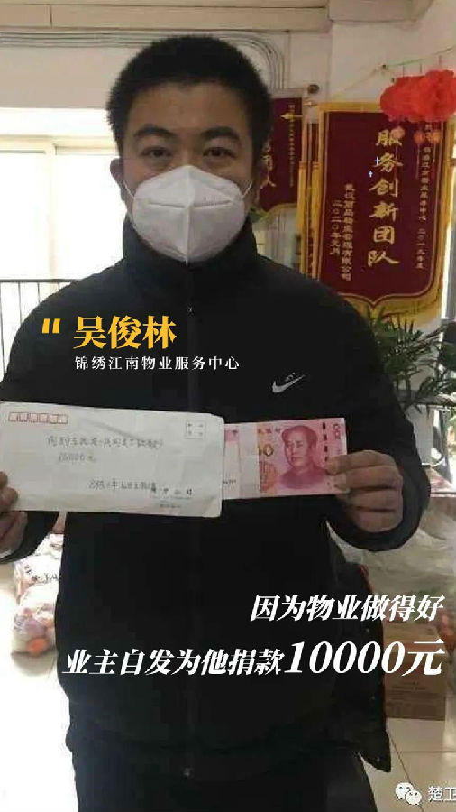 3月1日,吳俊(jun)林(lin)和(he)往常一樣來到崗(gang)位(wei)準備工作,在辦(ban)公桌上發現了(le)一個(ge)信(xin)封(feng),信(xin)封(feng)外寫著:錦繡江南(nan)8棟1單(dan)元全體業主自愿捐贈(zeng)。吳俊(jun)林(lin)打開一看是10000元錢。