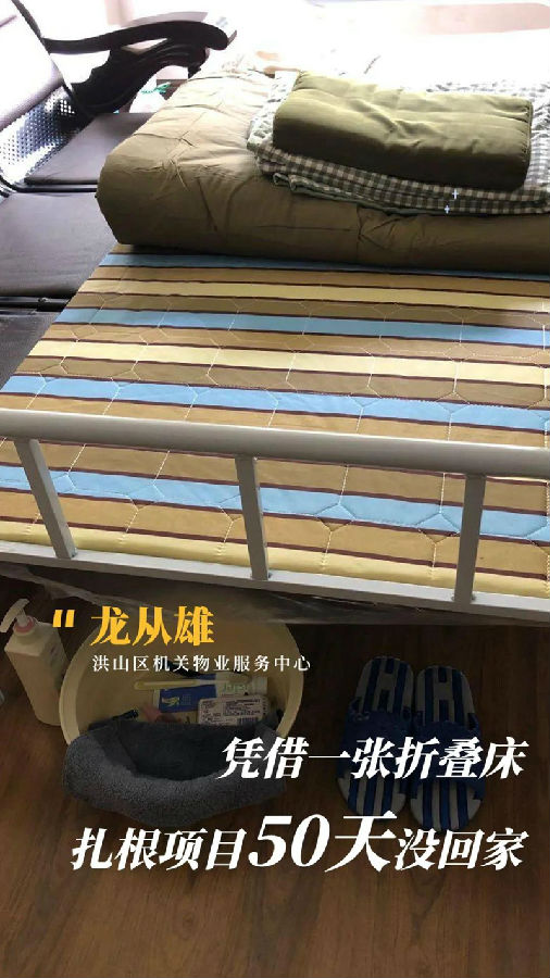 因為政府辦公樓項目的(de)特殊性(xing),疫情期間(jian),洪(hong)山區機(ji)關(guan)(guan)大樓320多(duo)名機(ji)關(guan)(guan)人員(yuan)均在崗辦公。為配合(he)防控(kong)指揮,協助進行(xing)防疫物資(zi)派發(fa)等工作,洪(hong)山區機(ji)關(guan)(guan)物業服務中心(xin)項目主(zhu)任(ren)龍(long)從雄扎根項目,一待(dai)便(bian)是近50天。