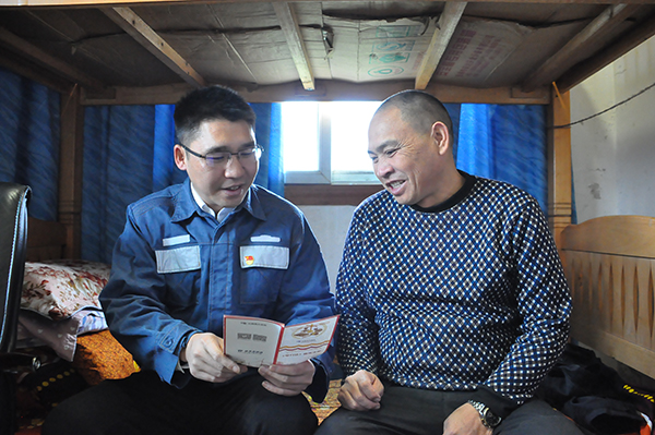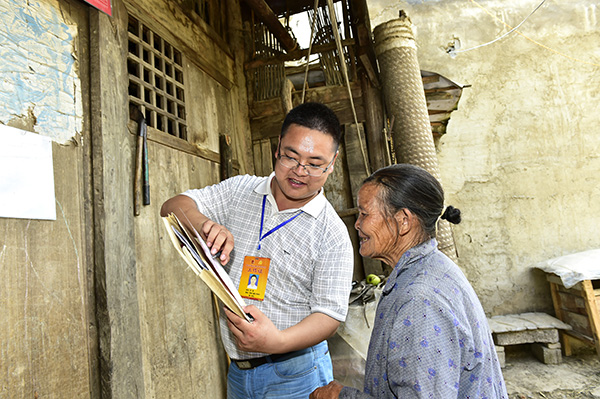 嚴召波走訪貧困戶,了解他們日常生活面臨的難題,向他們宣傳黨的政策。