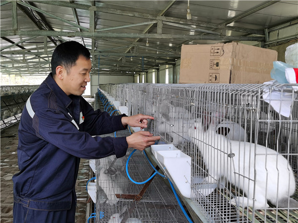 羅興國查看種兔的健康狀況,并仔細檢查每個兔籠的飲水設備是否良好。(譚鎮林 攝)