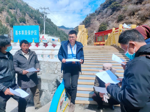 王彬(中)為阿壩州科農局介紹下大石溝村集體經濟產業項目