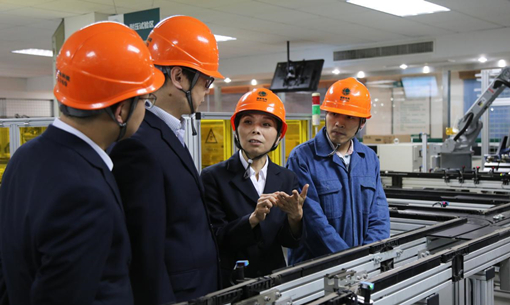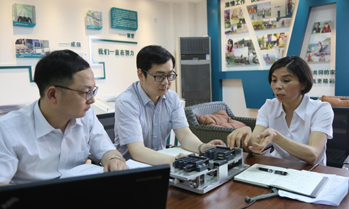 黃金娟(右二)與同事研究改進電能表自動化檢定流水線
