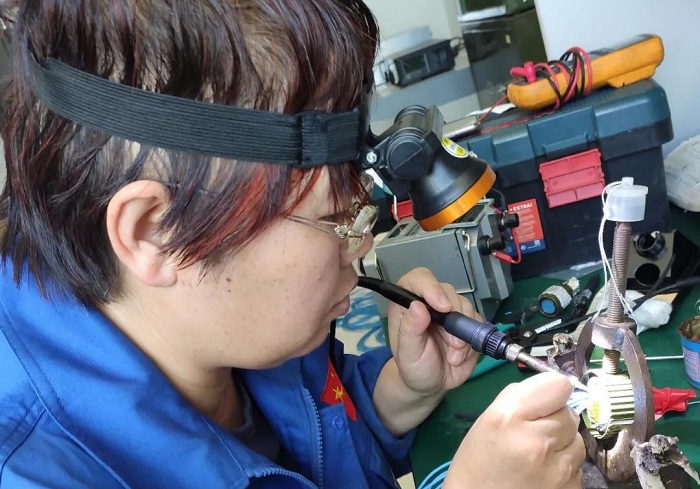 只見張(zhang)英紅帶著(zhu)一個(ge)頭(tou)燈,小心翼(yi)翼(yi)地把(ba)(ba)插頭(tou)固定在專用焊(han)具上,涂上松香、渡滿焊(han)錫,凝住神、屏住氣,一手(shou)拿焊(han)槍,一手(shou)拿焊(han)錫,快速、準確、穩妥的(de)把(ba)(ba)線焊(han)在了(le)(le)規定的(de)位置(zhi)。焊(han)接前幾個(ge)焊(han)點還容易些(xie),越(yue)到后面(mian)越(yue)艱難,焊(han)完最后一個(ge)焊(han)點的(de)張(zhang)英紅工(gong)服濕透,雙手(shou)也累得抖了(le)(le)起來。好在功夫不負有心人(ren),她憑(ping)借嫻熟的(de)技藝、超強(qiang)的(de)耐(nai)力把(ba)(ba) “硬骨(gu)頭(tou)”啃(ken)了(le)(le)下(xia)來,經核(he)查一個(ge)焊(han)點也沒點錯。