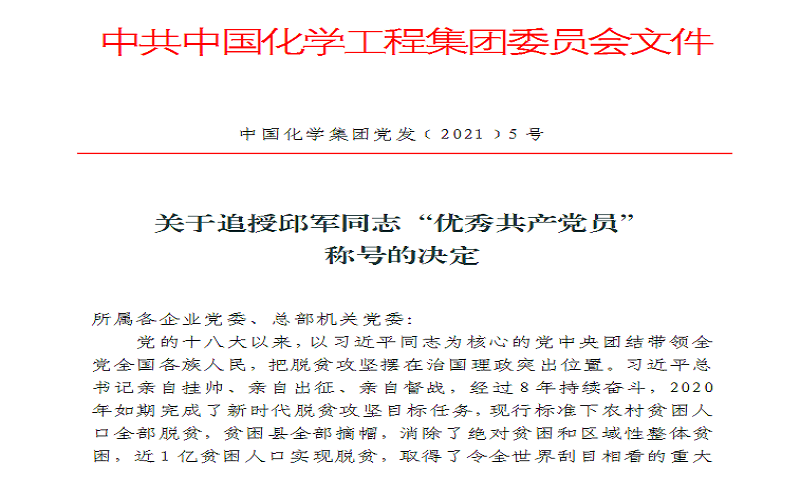 中(zhong)國(guo)化(hua)學(xue)(xue)(xue)工(gong)(gong)程黨委決定(ding)追(zhui)授邱軍(jun)同志(zhi)“中(zhong)國(guo)化(hua)學(xue)(xue)(xue)工(gong)(gong)程集團(tuan)有限(xian)(xian)公司優秀共產黨員(yuan)”稱(cheng)號(hao),并號(hao)召(zhao)全體黨員(yuan)干部、職(zhi)工(gong)(gong)群眾,學(xue)(xue)(xue)習(xi)邱軍(jun)理想信(xin)念堅定(ding)、對(dui)黨無限(xian)(xian)忠誠的(de)(de)政(zheng)治品格;學(xue)(xue)(xue)習(xi)邱軍(jun)扎根基層、無私奉獻的(de)(de)價(jia)值追(zhui)求;學(xue)(xue)(xue)習(xi)邱軍(jun)踐行宗(zong)旨(zhi)、赤誠為(wei)民(min)的(de)(de)精神境(jing)界(jie);學(xue)(xue)(xue)習(xi)邱軍(jun)腳踏實地、務實創(chuang)新(xin)的(de)(de)工(gong)(gong)作作風(feng)。